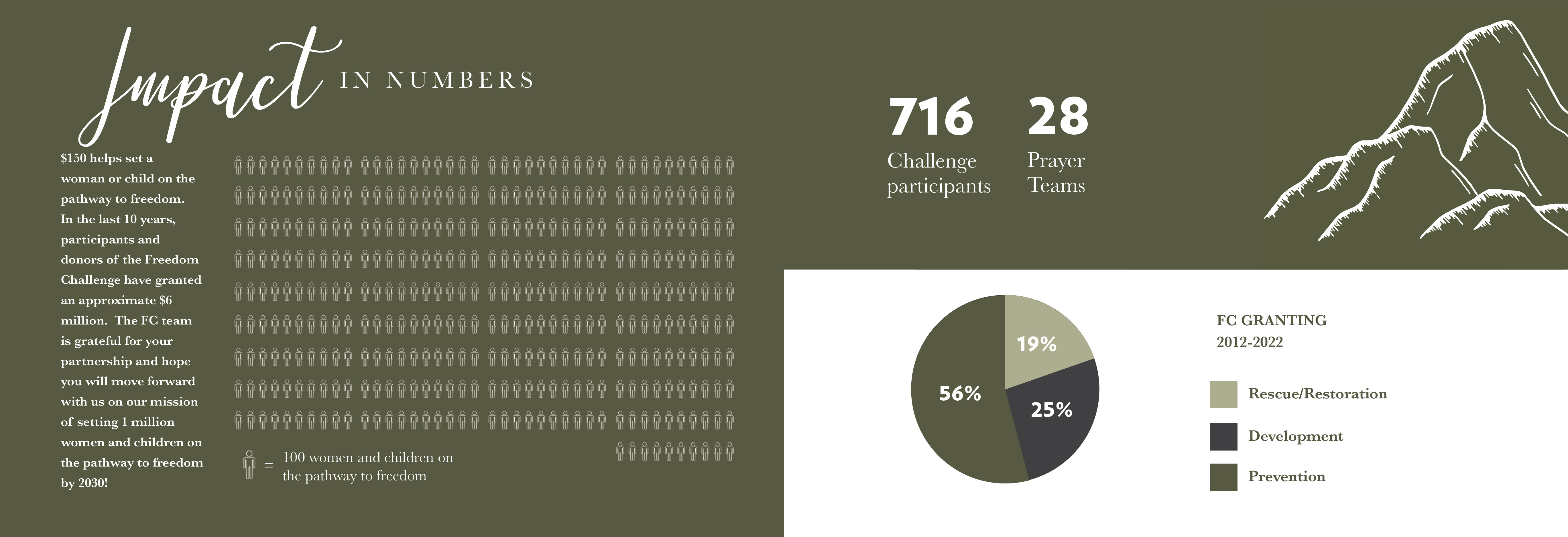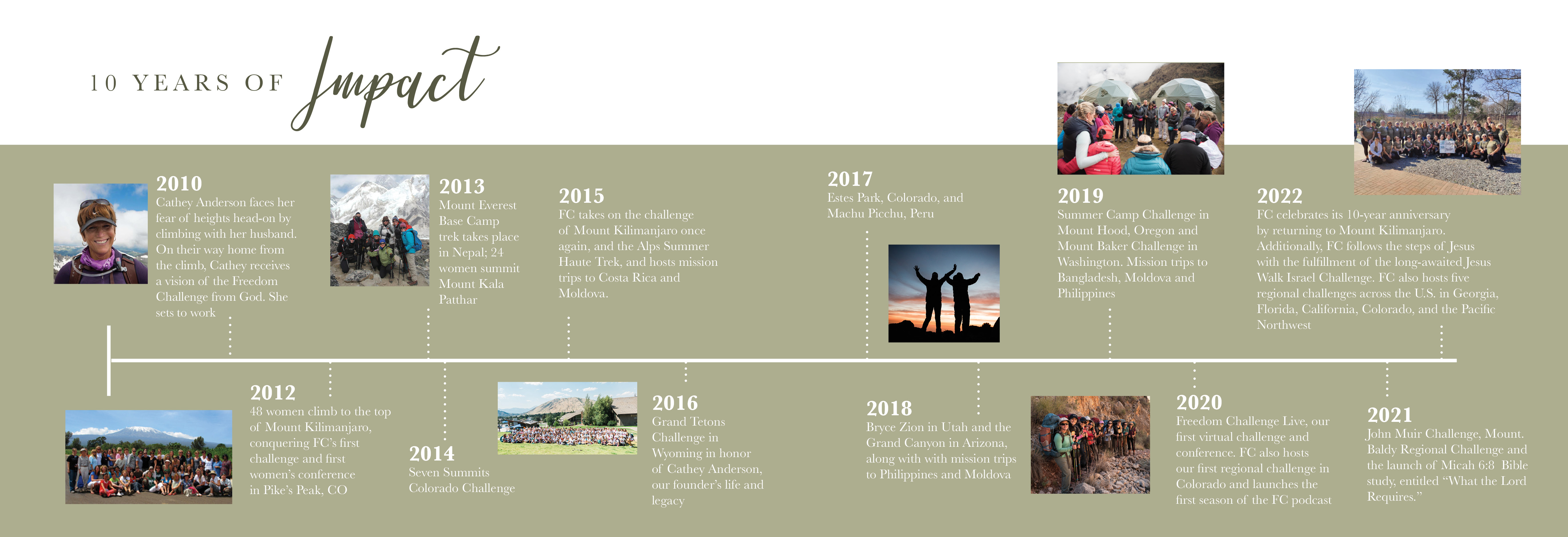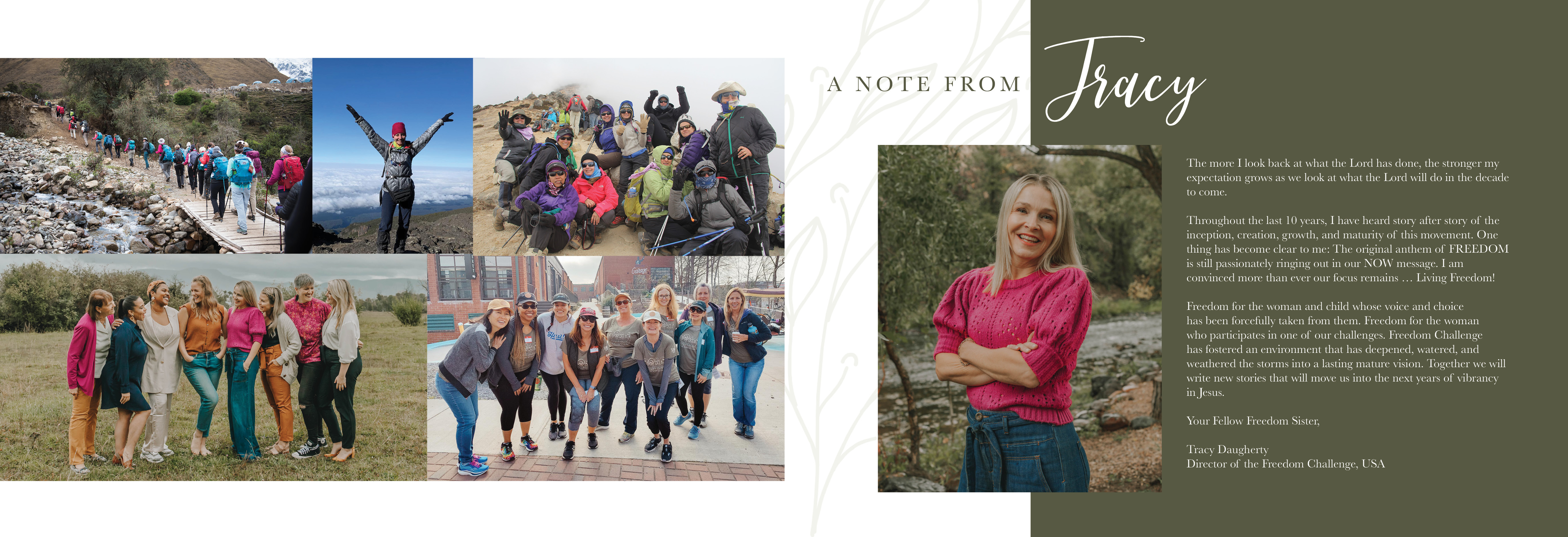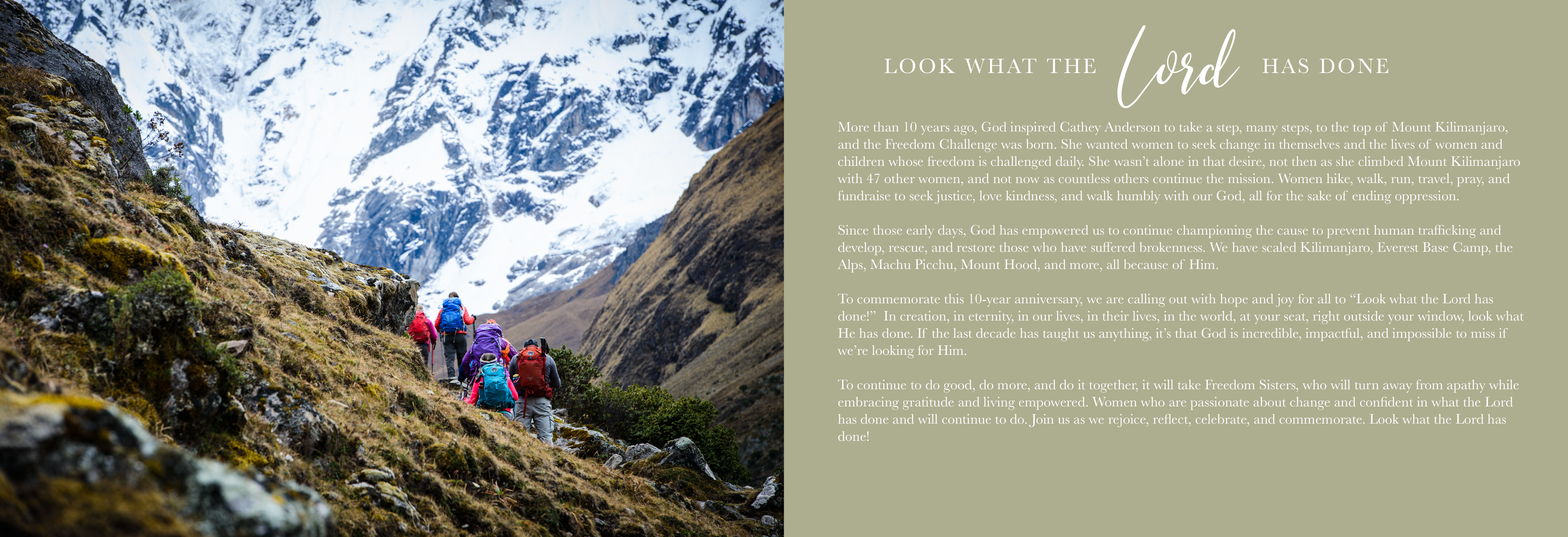 The Freedom Challenge is a project that is near and dear to my heart. It began as a grassroots movement to bring women together from around the world to do a physical challenge, such as mountain climbing, to raise funds to combat human trafficking. This is a report on all that we have accomplished over the past ten years.