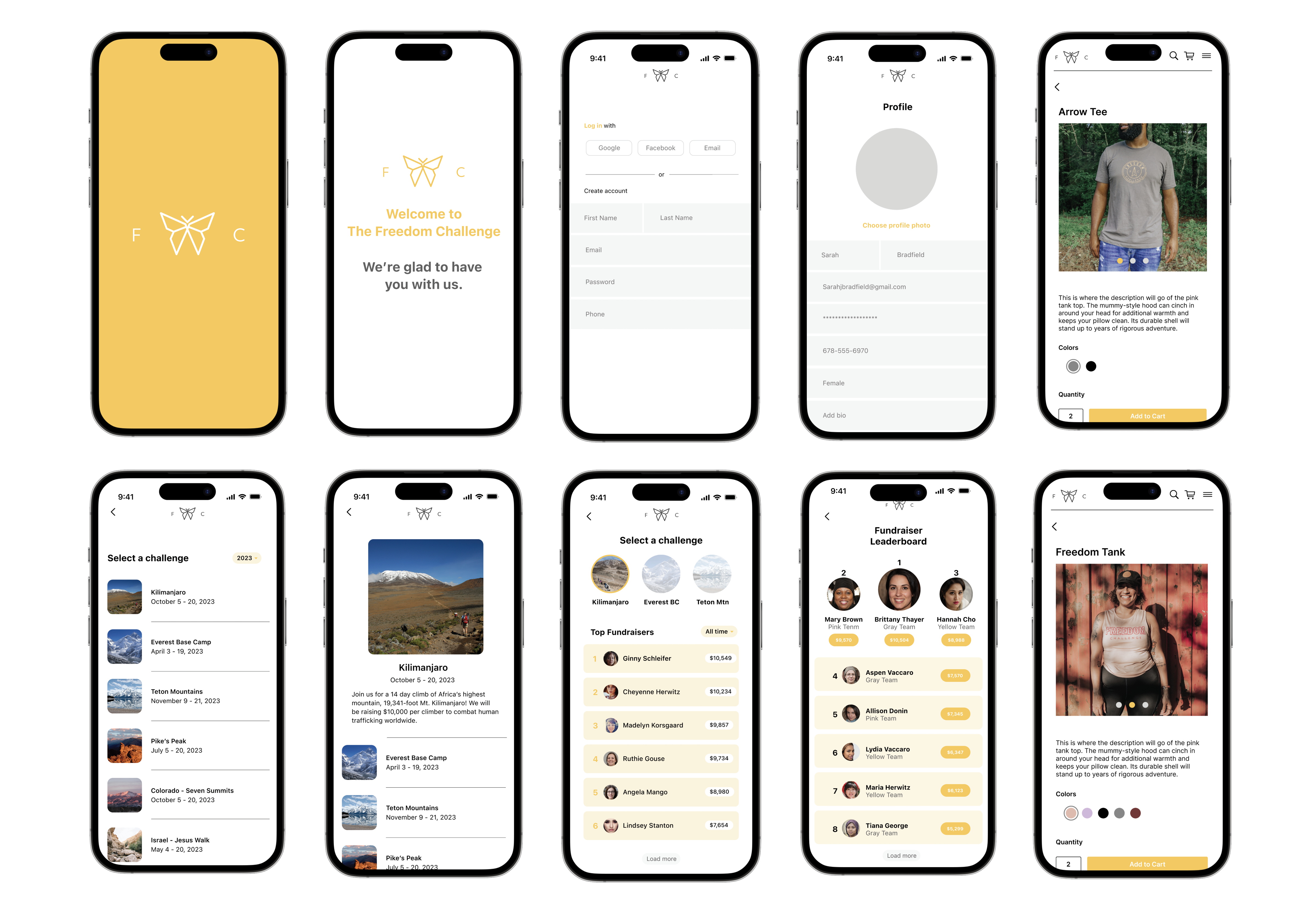 This is the beginnings of an app that I have designed for The Freedom Challenge, a project where women from around the world come to do physical challenges to combat human trafficking. The app has a store for FC merch, a fundraising tracker, and event information for each physical challenge.